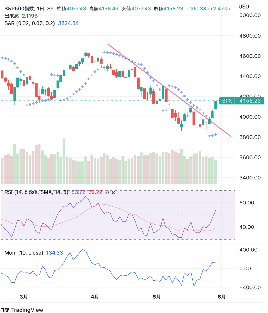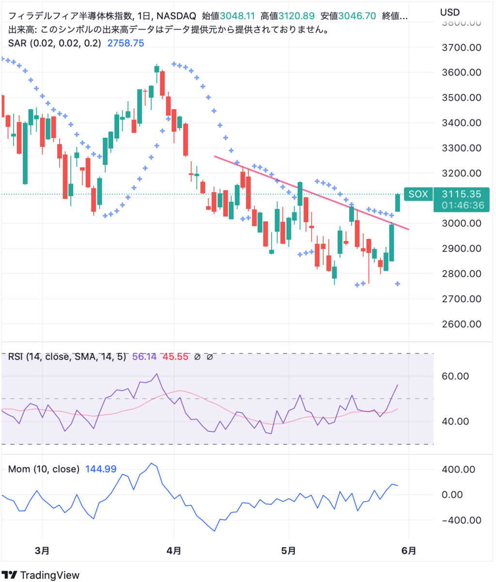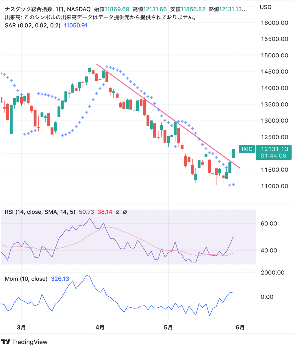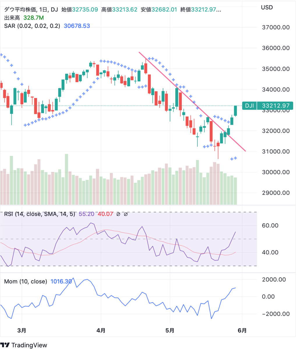 これを言い換えるとSARが上から下に出た時(陽転)が買いシグナルとなりますが、ダウ平均は5/26(木)に買いシグナルが出ています。
