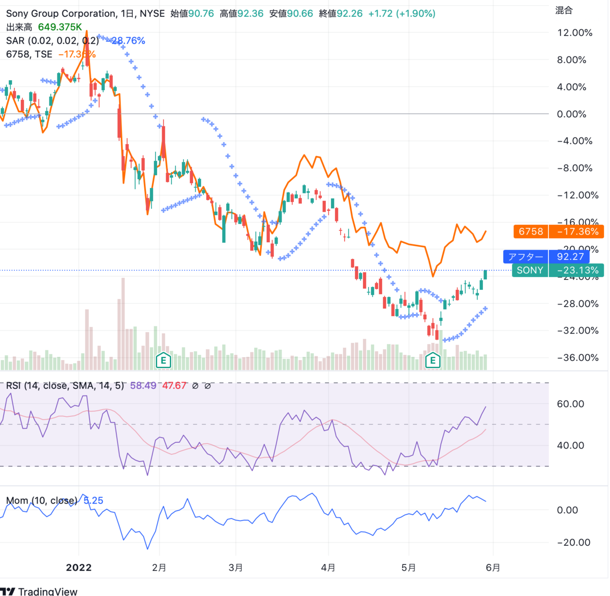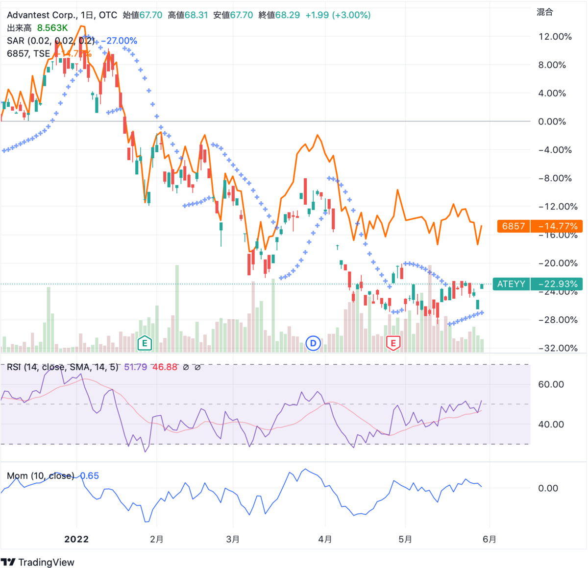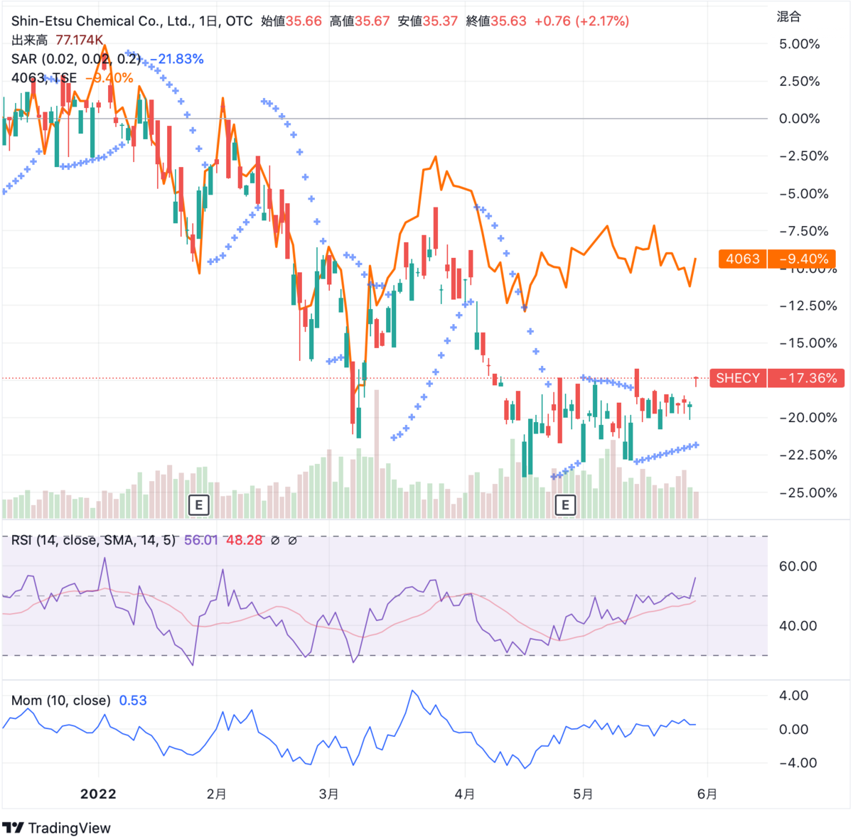 株価と合わせてパラボリック、また下段にはRSI(14日)、モメンタム(10日)を示します。