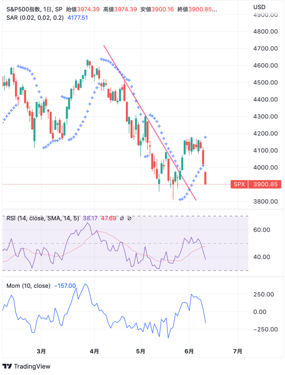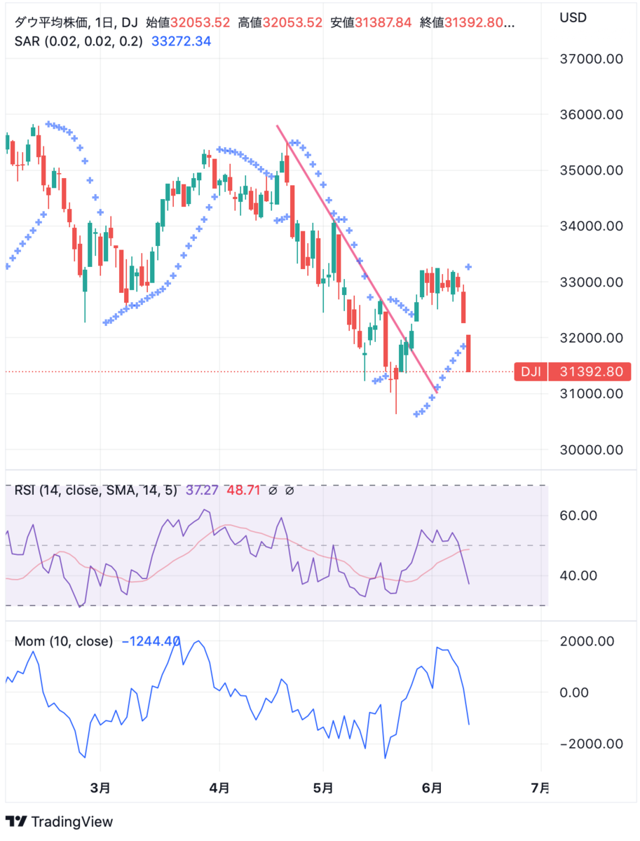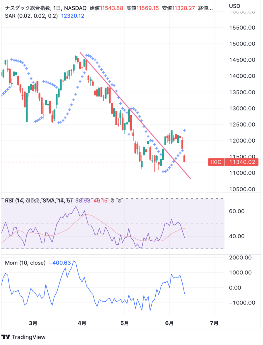 2週間前は記事に書いたようにパラボリック陽転しましたが、6/10(金)にて陰転(SARが株価の下から上になる)となりました。米国株価の大きな転換点はまだ先のようです。なお、インジケーターの表示内容は前回記事と同一です。