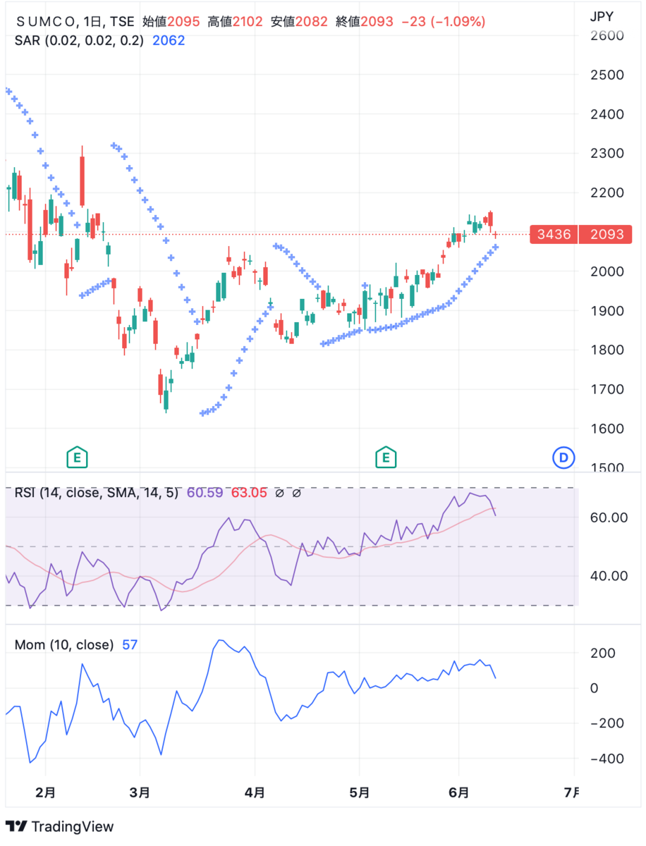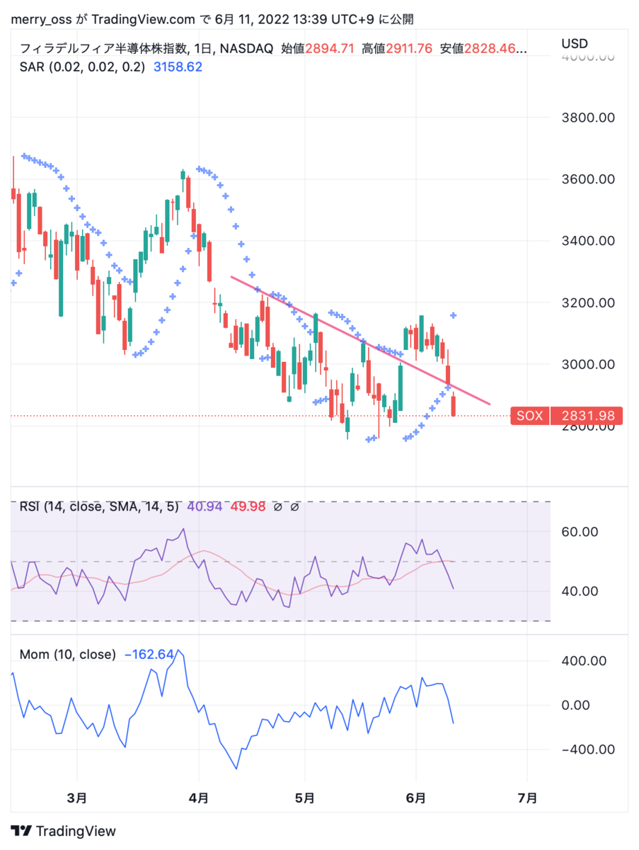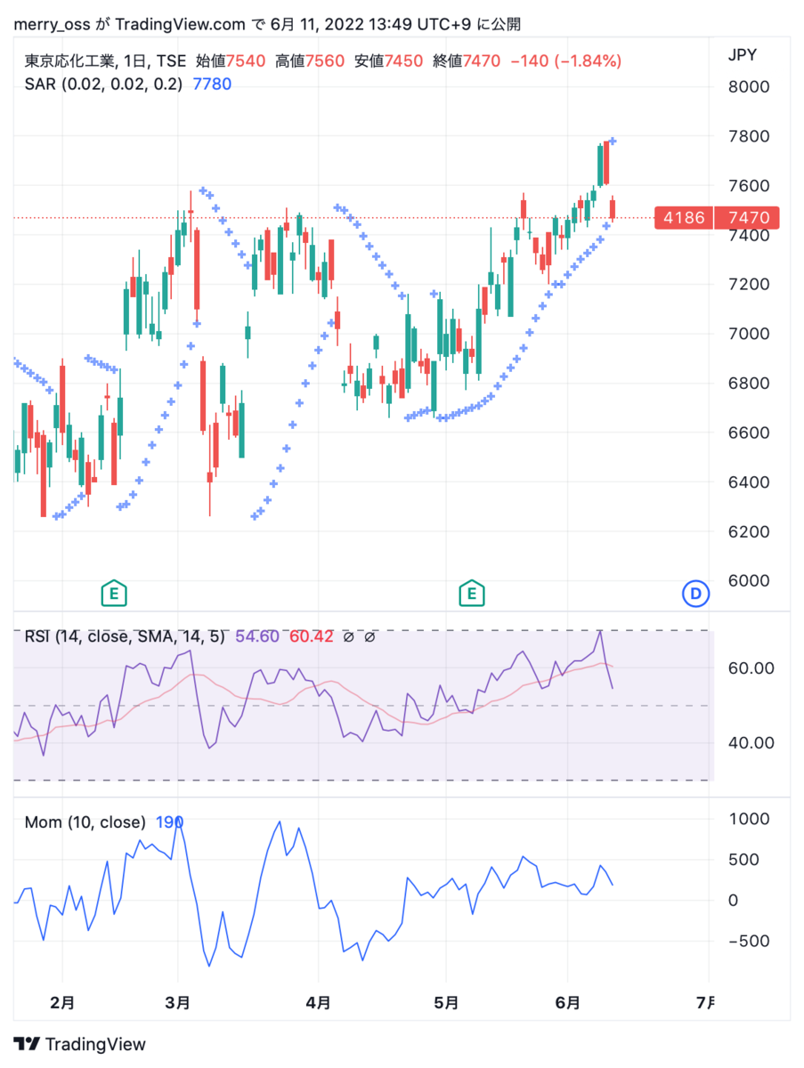 東京応化は既にパラボリック陰転しており更なる下落が懸念されます。SUMCOもそうですが、下げを拾うとしても前述の米国イベントが転換点になることを想定して6/17(金)くらいまでは慎重に様子を見たいと考えています。
