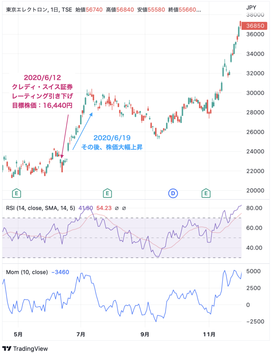 クレディ・スイス証券は、個人的には短期の売りが力強いという印象です。2年前の2020年6月12日にも、ここは半導体市況のピークアウトを予想して東京エレクトロンなどのレーティングを下げました。その後の株価は下記となります。