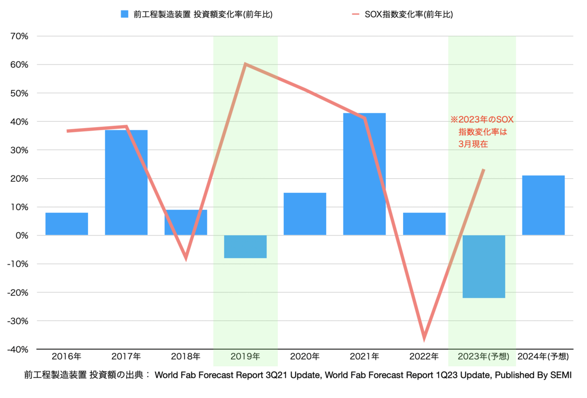 半導体関連銘柄の株価は、前工程製造装置の需要ピークから下がり始め、需要ボトムが確認される前には上昇している傾向がありそうです。下図にて、前工程製造装置の投資額変化率(前年比)を棒グラフ、SOX指数変化率(前年比)を折れ線グラフとして示しました。