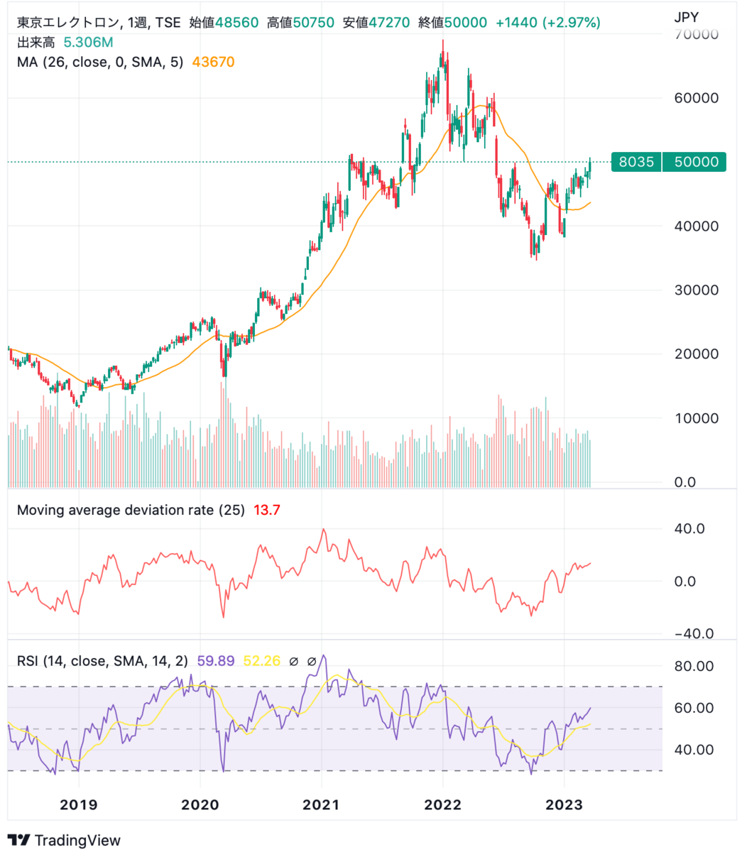 一方で、東京エレクトロンは半導体関連銘柄のど真ん中でありながらも比較的上昇が遅れていそうに思います。米国利上げが一服してドル円が円高になっても、業績への為替影響が軽微なのも良さそうに思います。