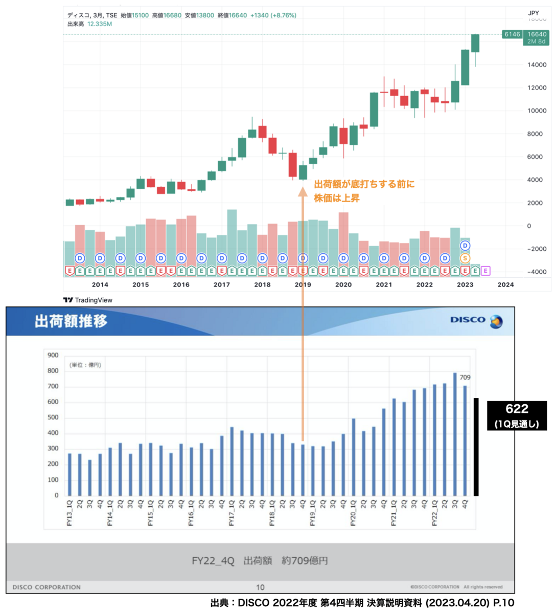 4/20(木)に本決算発表があったディスコが、決算翌日に株価+14.05%と大きく伸びました。今期(23年1Q)の出荷額は更に減少しそうだという内容でも大幅高となっており、「この上げは本物なの?」と思われたりもしたのではないでしょうか。決算後のPTSでは下げていましたし…。このブログでは、シリコンサイクル的に2018年〜2019年の株価動向が現状の参考になるのでは?とよく書いていますが、今回も2018年〜2019年の半導体不況期の株価をおさらいしてみました。