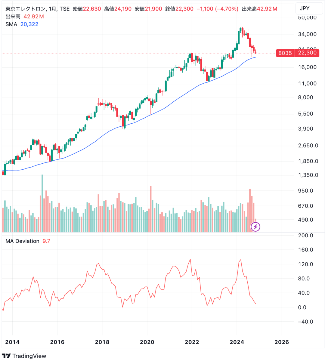 HBM向けのTSV(though-silicon via)用装置なども手掛けておりAI関連に乗れていそうかなとも思っていましたが、会社発表の25Q1売上予想が弱めということで決算発表翌日の株価は-9.20%と大幅下落となりました。アフターでは+0.34%でしたので、週明けに回復できるのか気になるところです。25Q1売上が弱めといっても市場予想に対して-1%程度だったとのことですので他要因があるようにも思いますが…11/15(金)はOpExだったりと。
