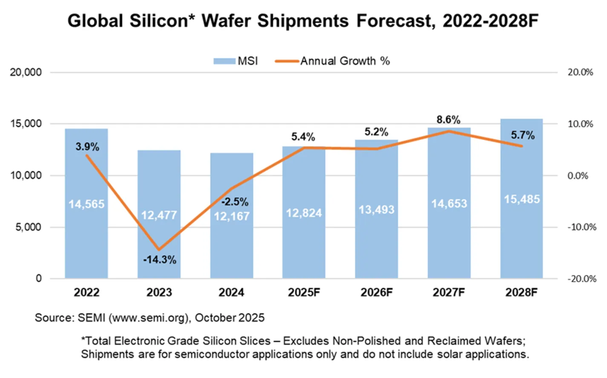 シリコンウェハ需要についてですが、SEMIから10月にウェハ出荷額予想が出ています。それによると2024年を底として回復傾向となっています。
